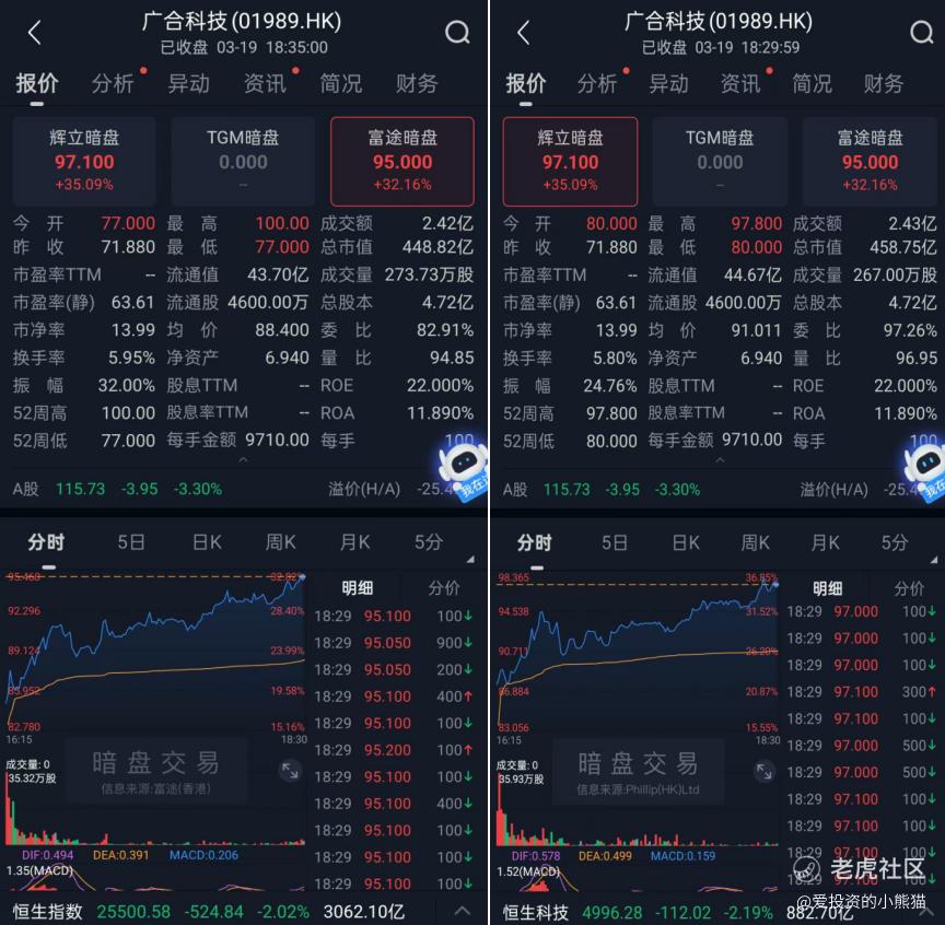 广合科技(01989.HK)辉立暗盘以80.00港元高开,立马上冲再震荡上行,最高摸到97.800港元,尾盘稍有回落收97.10港元,涨幅为35.09%,振幅24.76%,成交2.43亿港元。