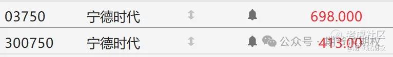 我们来对比一下A股和港股的宁德时代,下图是今天(26年3月20日)A股和港股的收市价。