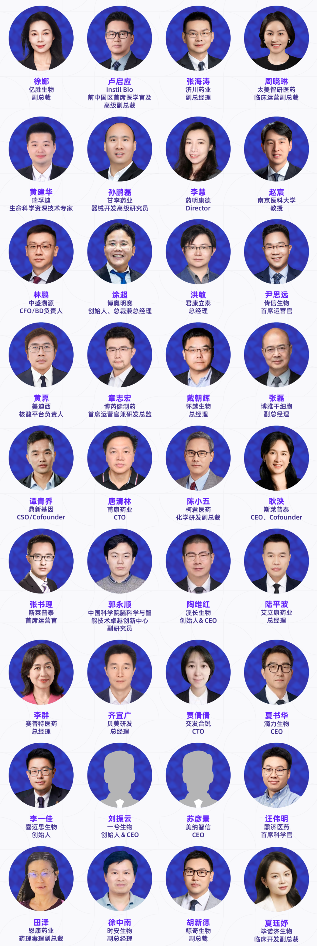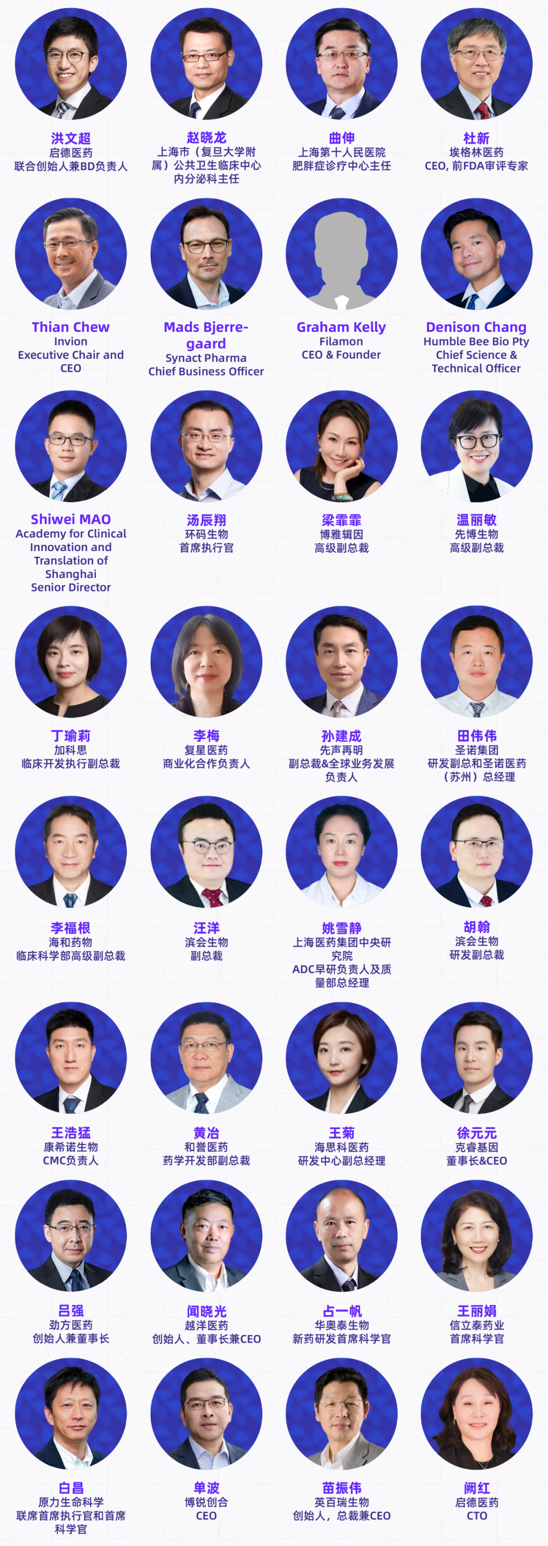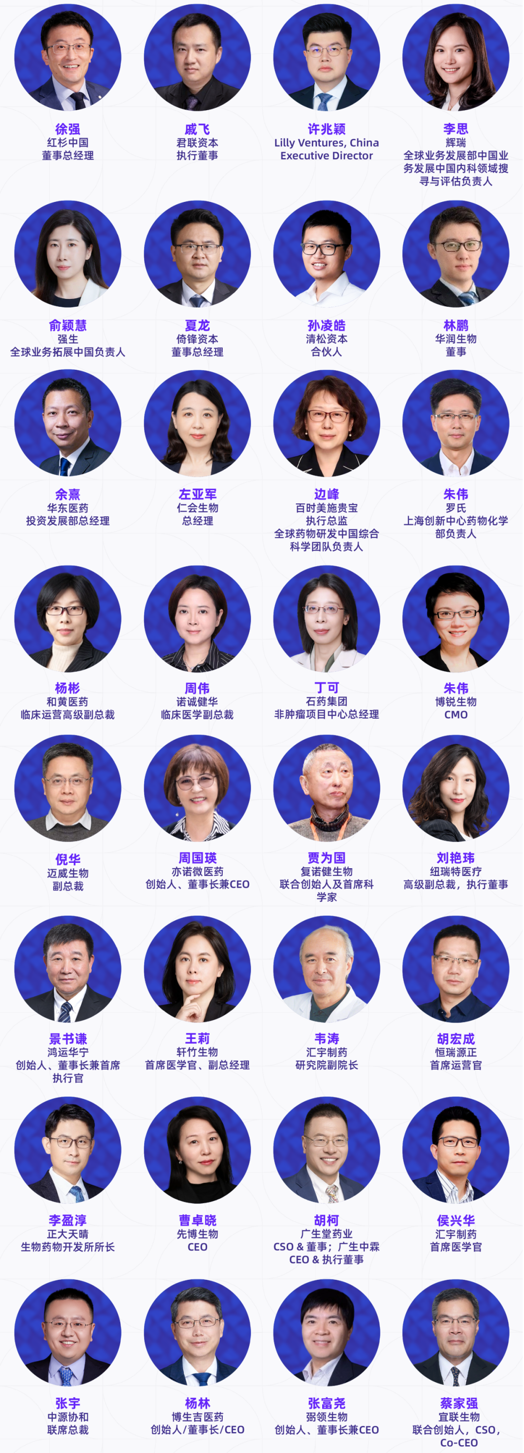 本届大会已确认230+讲者加入,覆盖跨国药企、国内外药企、Biotech高管、创始人、全球开发负责人及核心技术负责人、头部CRO/CDMO管理层及技术专家、科研院所研究学者、临床研究负责人以及投资决策人等产业实践者。他们代表行业领先水平,直接参与真实项目的立项评估、早期发现、临床前研究、临床推进、工艺放大与全球注册路径设计等环节。