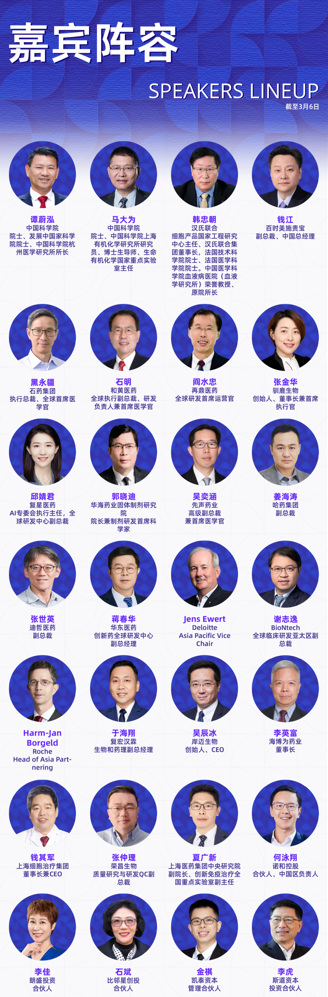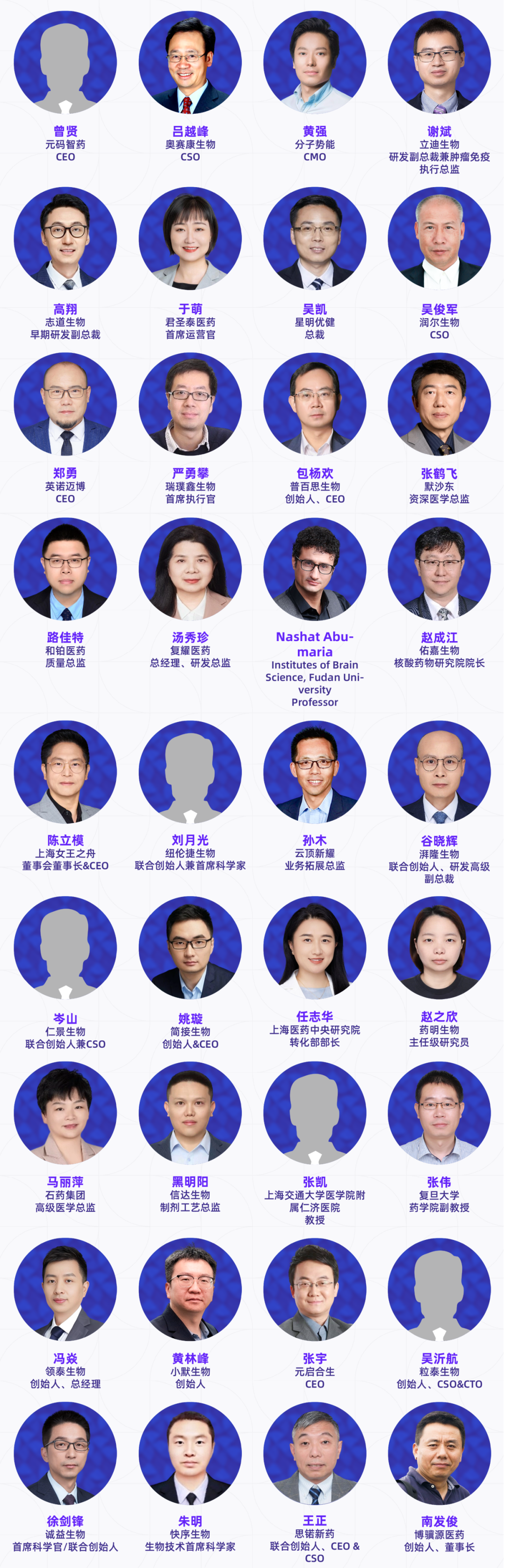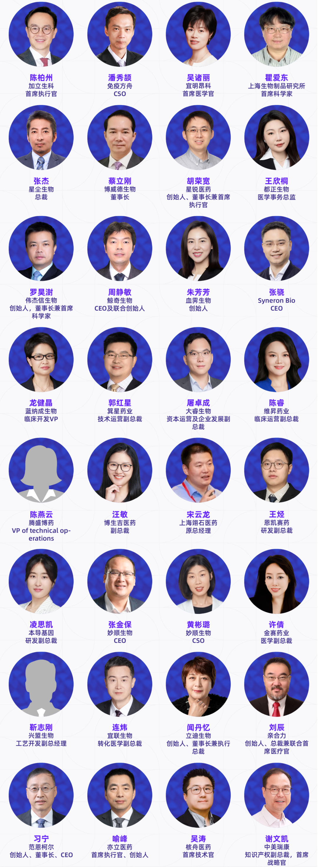 本届大会已确认230+讲者加入,覆盖跨国药企、国内外药企、Biotech高管、创始人、全球开发负责人及核心技术负责人、头部CRO/CDMO管理层及技术专家、科研院所研究学者、临床研究负责人以及投资决策人等产业实践者。他们代表行业领先水平,直接参与真实项目的立项评估、早期发现、临床前研究、临床推进、工艺放大与全球注册路径设计等环节。