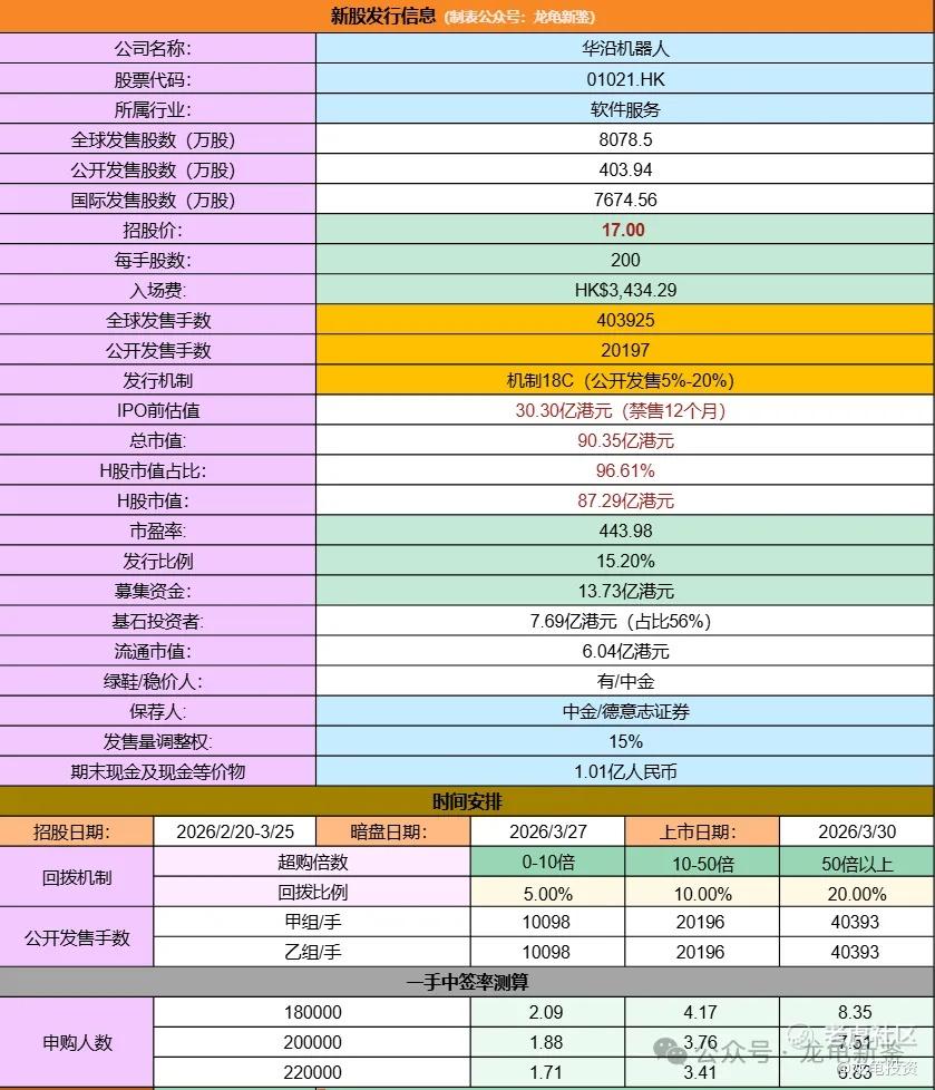 华沿全球发售股数8078.5万股,每手股数200股,招股价17.00港元,入场费3434.29港元,采用机制18C发行,首日孖展倍数34.93倍,回拨20%后公开发售手数80786手,预计18-22万人参与,一手中签率5%左右,申购500手稳一手。