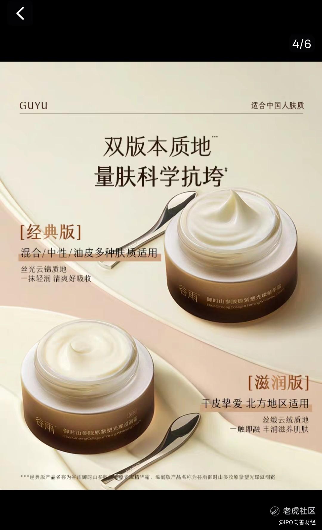 根据凤凰网的报道,2025年9月前后,谷雨则开设了专门的“抗老直播间”,主播在推广“御时极光山参胶原抗皱美白水乳”时,不断强调其抗老功能。
