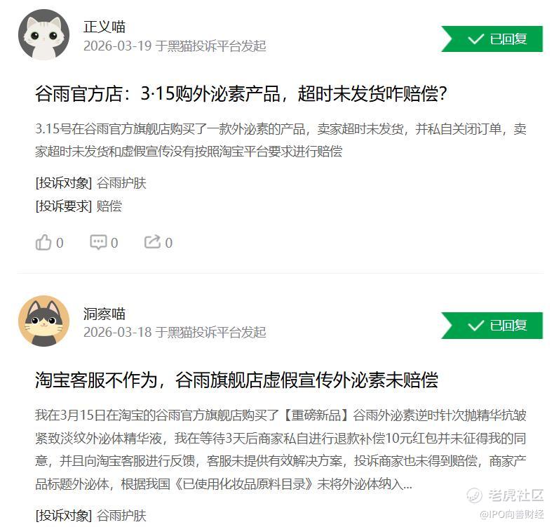 就拿谷雨在消费者中间的反馈来说,在第三方投诉平台“黑猫投诉”上,近期出现了多起关于“谷雨外泌素”产品的投诉,涉及“虚假宣传”、“超时未发货”等问题。