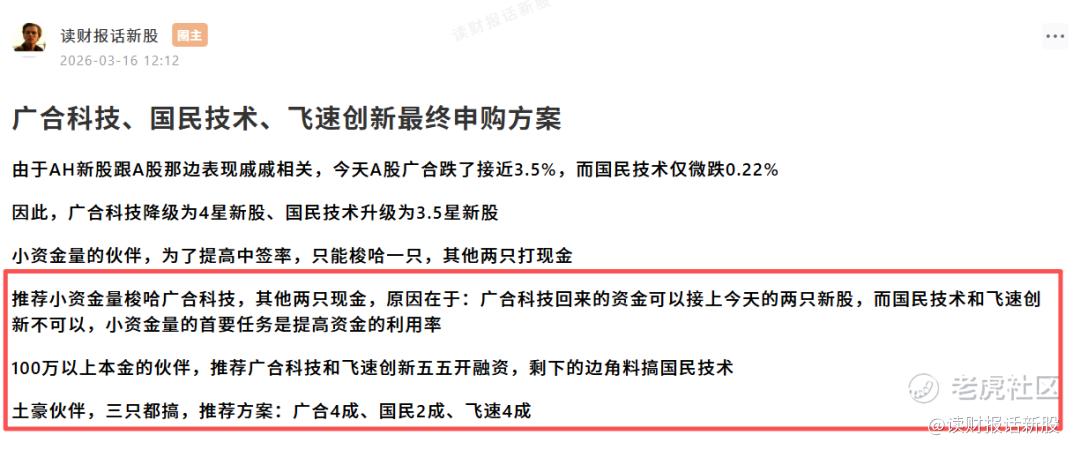 对于资金量小的伙伴,只能梭哈一只,财哥建议是梭哈广合科技(因为资金回来可以继续打凯乐士),其他两只现金打打