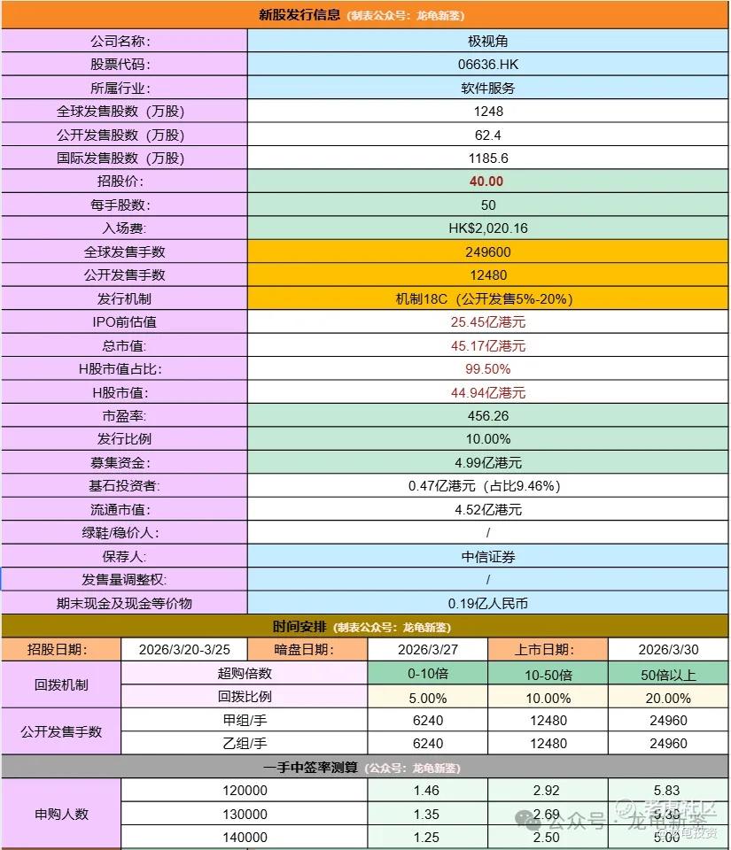 极视角全球发售股数1248万股,每手股数50股,招股价40港元,入场费2020.16港元,采用机制18C发行,孖展倍数54.18倍,回拨20%后公开发售手数49920手,预计12-14万人参与,一手中签率5%左右,申购1400手稳一手。