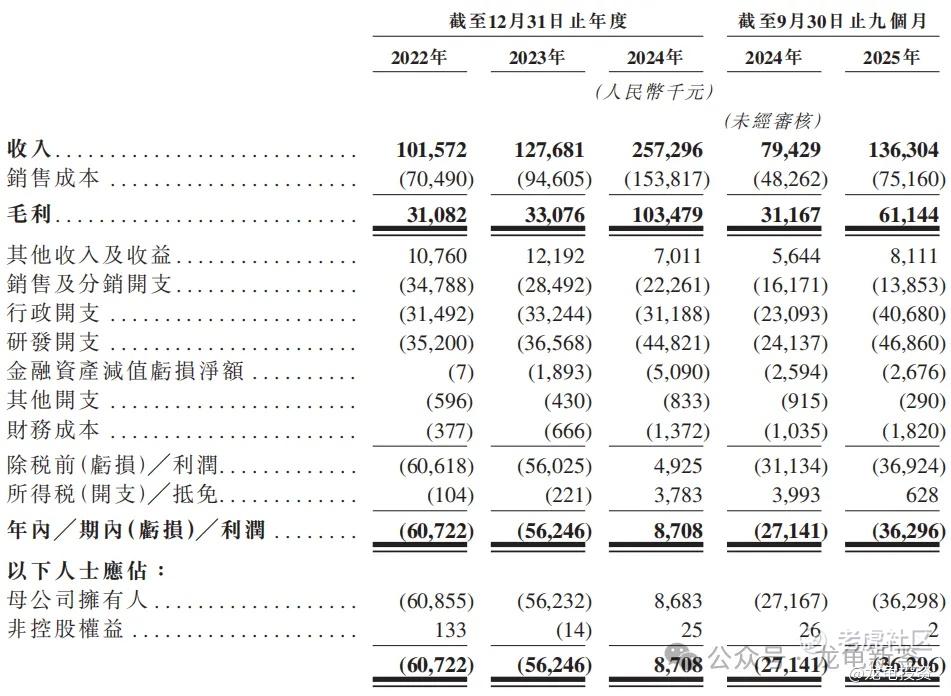 22年净亏损-0.61亿,23年净亏损-5624.6万,24年净利润870.8万;25年Q3净亏损-3629.6万,较上年同期净亏损-2714.1万,亏损再一次扩大,原因是研发和行政开支双增。