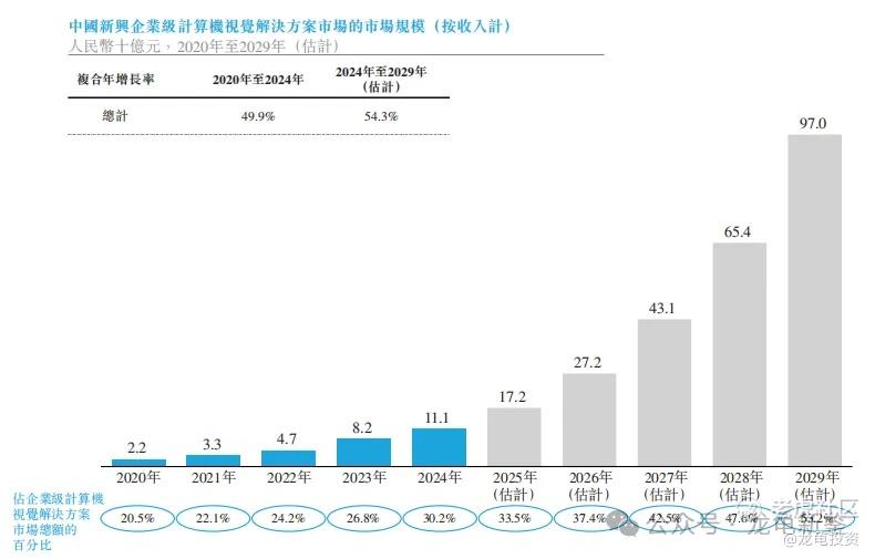 中国新兴企业级计算视觉解决方案的市场规模由2020年22亿元增至2024年111亿元,复合年增长率为49.9%;预计至2029年,中国新兴企业级计算机视觉解决方案市场规模将达到970亿,复合年增长率为54.3%;其在整体企业级计算机视觉解决方案的渗透率将提升至53.2%。