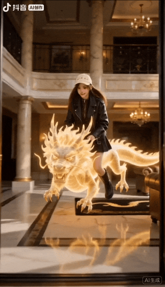 在广告片结尾,两位外甥“召唤神龙”、腾龙而起的特效既抽象又上头,给人留下深刻印象。抖音电商特地提供了现成AI特效模板,让合作品牌、用户可以轻松参与、复刻名场面:品牌添加产品元素、用户上传照片,便可生成同款特效,置身于龙形地毯上,日历飘落,地毯化身真龙、飞向空中。