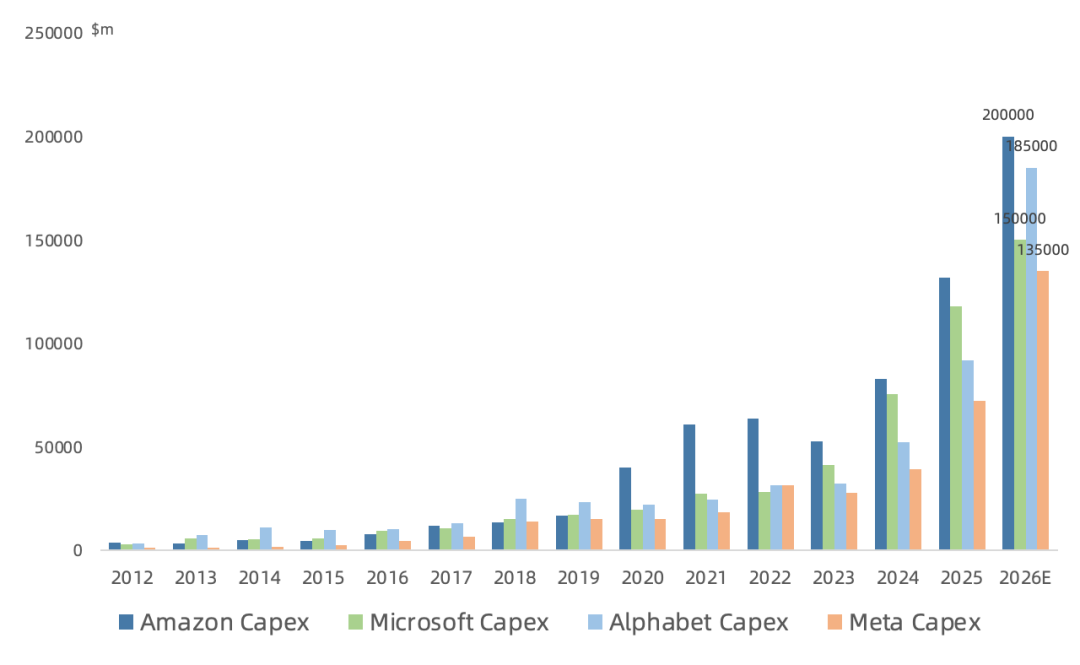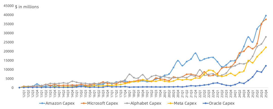 亚马逊Q4 capex 395亿美元,大部分投入到AI,绝大部分AI资本开支与产能都是给外部客户使用;预计2026年capex 2000亿美元,其中绝大部分投向AWS,因看到了AWS非常高的需求,会在2027年、2028年继续增加更多算力;管理层最近喊出十年内AWS年营收会达到3000亿美元(较目前翻倍)的口号。