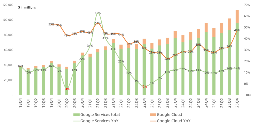 谷歌云Q4营收177亿美元,同比增长48%,增速环比加速14个百分点;经营利润53亿美元,经营利润率30%,同比提升13个百分点。
