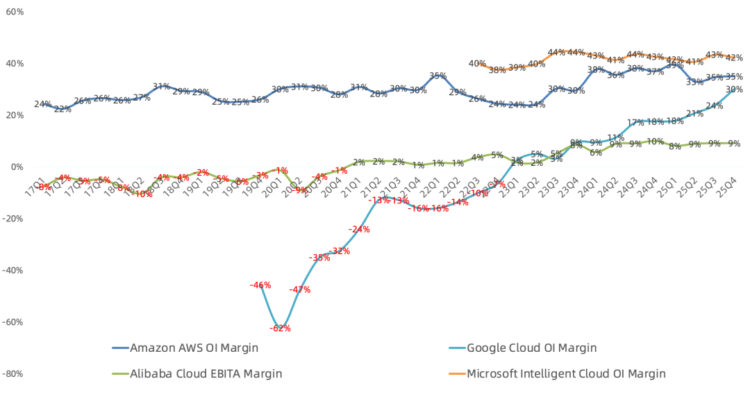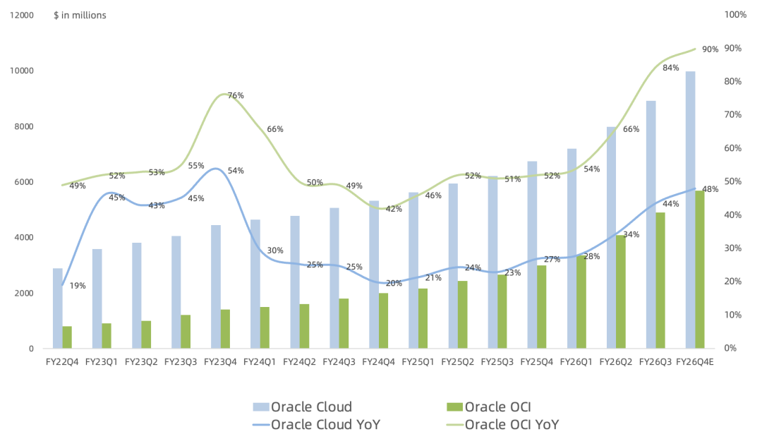 甲骨文云Q1(财报较早,FY26Q3)营收89亿美元,同比增长44%,增速环比增长10个百分点,其中OCI(IaaS)营收49亿美元,同比增长84%,增速环比增长18个百分点;此前管理层预计FY27/FY28/FY29/FY30 IaaS营收分别为320/730/1140/1660亿,OCI毛利率将会在30%-40%之间,本季度对应的毛利率达32%,OCI AI相关营收同比增长243%,交付400MW容量。