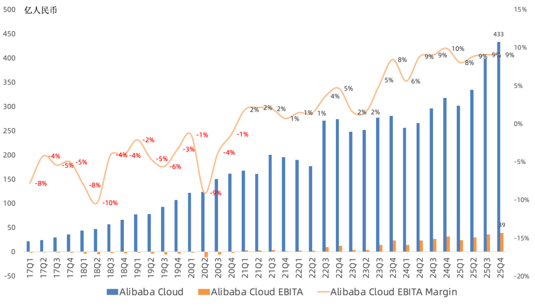 Q4营收433亿人民币(61.9亿美元),同比增长36%,增速环比加速2个百分点,不考虑内部合并营收,同比增长35%,增速环比加速6个百分点;AI相关营收连续10个季度实现同比三位数增长;今年2月份千问全平台月活超3亿;阿里云五年目标1000亿美元,MaaS收入将超IaaS成最大产品。