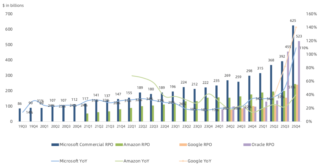 本季度三大云AI赢家(AWS、GCP)和输家(Azure)再度更新,在AI计算需求严重供不应求背景下,除了AI数据中心建设速度外,算力资源的分配(微软“战略失误”)也决定了云计算营收的增速。甲骨文与Neocloud仍深陷债务、杠杆质疑中,急需算力快速爬坡来打消市场顾虑。