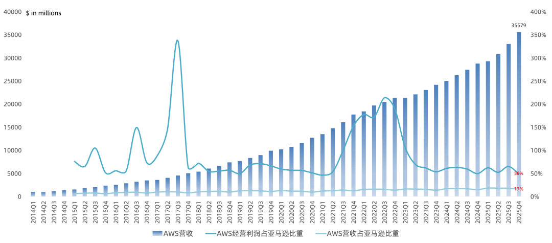 AWS Q4营收356亿美元,同比增长24%,增速环比加速4个百分点,创下13个季度以来新高,环比增长8%;经营利润125亿美元,同比增长17%,经营利润率35%,同比下滑2个百分点。