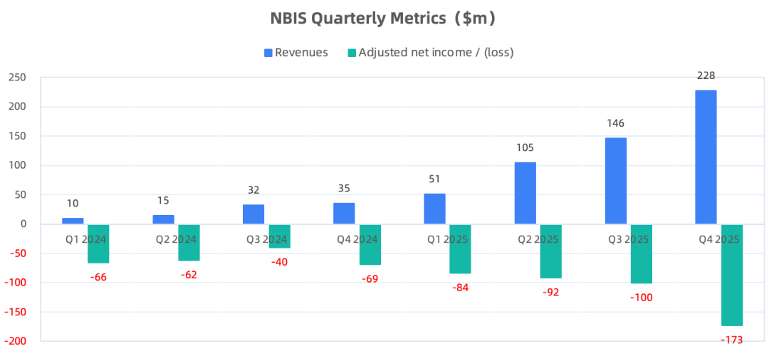 Nebuis Q4营收2.28亿美元,同比增长547%,其中核心AI云营收2.14亿美元,同比增长超800%,营收占比接近94%;毛利率减去折旧后为-9.4%,调整后EBITDA盈利1500万美元,同环比扭亏,EBITDA Margin 7%;本季度首次实现经营现金流和EBITDA转正;Q4 capex 20.6亿美元,同环比激增。