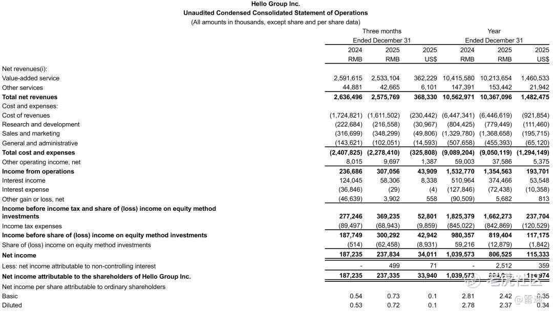 陌陌母公司挚文集团 (MOMO) 日前发布截至2025年12月31日的全年及第四季度财报。财报显示,挚文集团2025年营收为103.67亿元(约14.83亿美元),较上年同期的105.63亿元下降1.9%。
