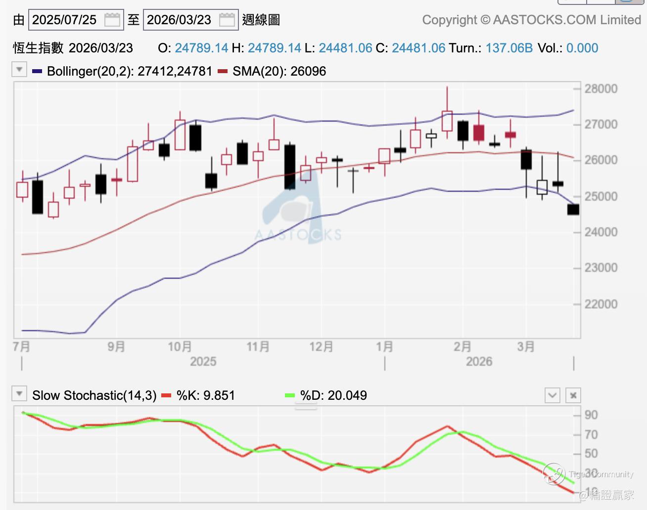 再比个周线图出嚟有见指数低走于50周线,同时保历加通道口都有见拓阔,依家最贴价嘅熊证同现价都有成千点距离,但嗰几只都坐住唔少街货,还好今日都有一堆比较贴价嘅熊证新上市,无街货如 $UB#HSI RP28129.P(61385)$ ,收回价25826点,同现价有约1252点距离,所以杠杆得返17.8倍。
