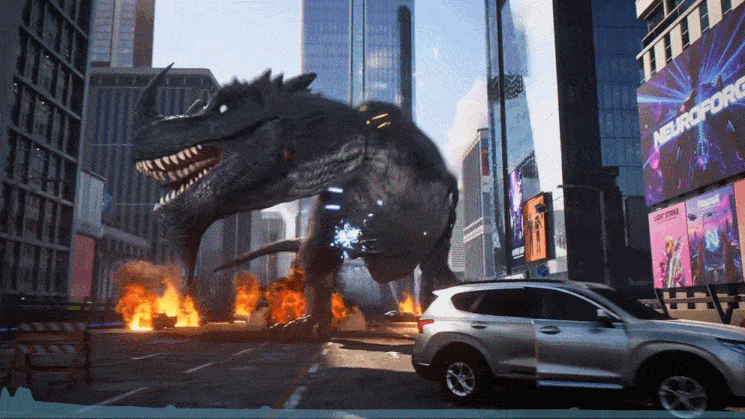 不同地图或许是需要通关的副本,也或许会配备不同的玩法机制。就像PV里的战斗,就堪称“元素大乱炖”——恐龙在现代城市横冲直撞,一尾巴扫飞四周车辆,而与之对抗的则为玩家队伍,成员包括乘坐飞行滑板的枪手、使用符箓攻击的修士、搭载盾牌与炮弹的机甲,以及发射闪电光束、神似“蜘蛛侠”的超级英雄。