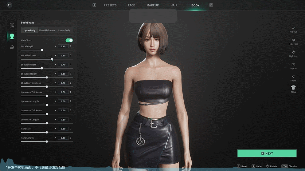 视频以捏脸环节开场,整体风格偏写实。玩家可调整主角的脸型、发型、身材等,甚至耳朵的位置形状、腹肌的明显程度等细节,也供玩家自行修改。