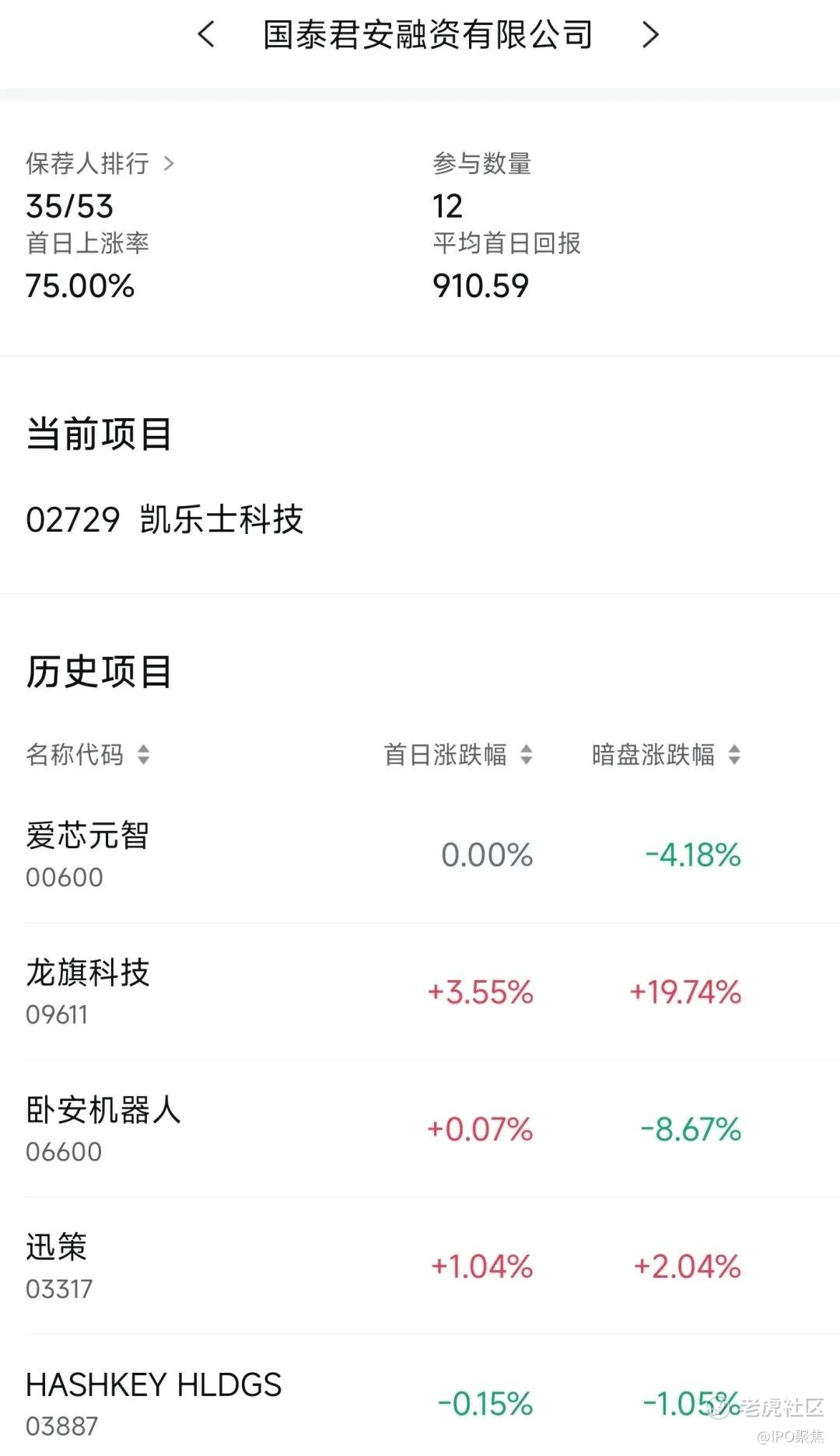 在国泰君安国际近2年保荐港股项目中,首日上涨率为75.00%,平均首日回报910.59港元。