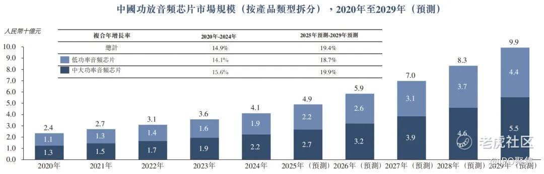 随着消费电子AI应用的加深、音频方面的升级及新能源汽车的快速发展,中国功放音频芯片的市场规模持续扩大。据弗若斯特沙利文数据,按总营收计算,中国该芯片的市场规模从2020年的24亿元增至2024年的41亿元,复合年增长率为14.9%,后续预计将以19.4%的速度增至2029年的99亿元。