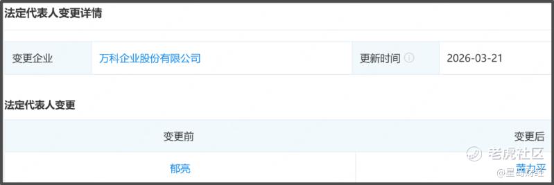 3月21日,企查查显示,万科企业股份有限公司(下称“万科”)法定代表人出现变更,郁亮正式卸任,由深铁党委副书记、董事、总经理兼万科董事长黄力平出任。这意味着郁亮已从工商登记层面完成与万科的剥离,其在万科35年的职业生涯正式落幕。