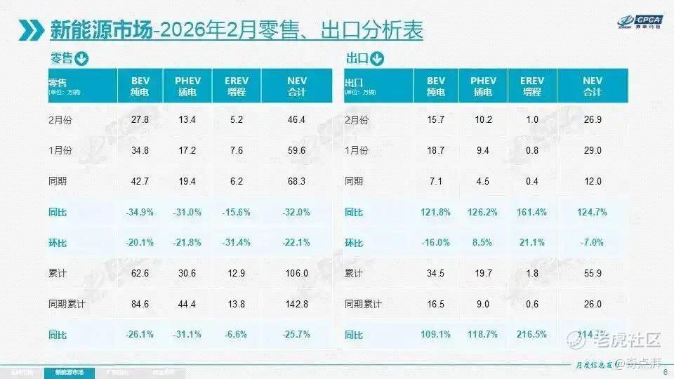 今年 1 月,据乘联会统计新能源乘用车零售销量 59.6 万辆,同比下降 20.0%。2 月,新能源乘用车零售销量达到 46.4 万辆,同比下降 32.0%。虽然有春节、年末等一系列因素的影响,但任何行业在高速增长后走向稳定是客观存在的规律。