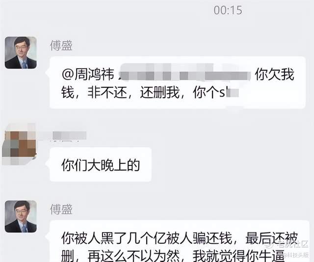 聊天截图显示,傅盛@周鸿祎并直言:“你欠我钱,非不还,还删我,你个xx。”