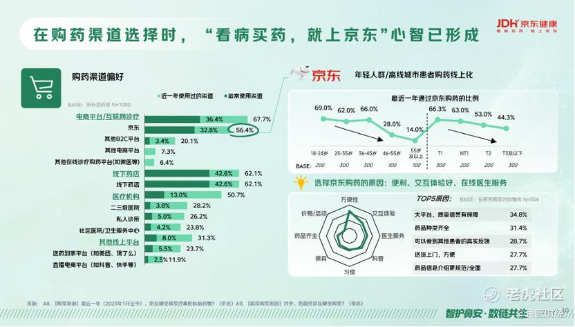 白皮书数据显示,67.7%的用户近一年内使用过电商平台购药,其中选择京东的用户占比达56.4%,年轻群体和高线城市患者的线上购药习惯尤为明显。在自主选购方面,84.2%的用户通过搜索关键词自行决策,其中超过三成直接搜索“鼻炎”“鼻窦炎”等病症名称。