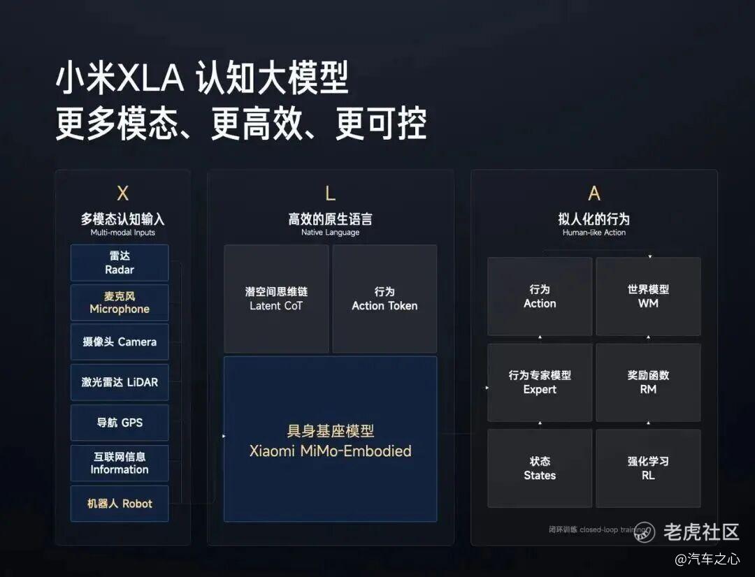 新 SU7 将会搭载小米自研 XLA 认知大模型。X、L、A 分别代表多模态认知输入、原生语言、拟人化行为,本质上这类架构也是趋近于特斯拉、小鹏等主流玩家的 VLA 模型。