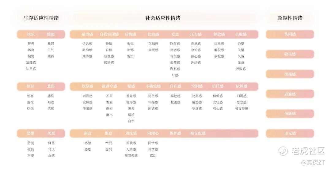 而小红书的「情绪研究方法论」正是以情绪产生的三层来源(生存适应性、社会适应性、超越性)为基础,结合“效价-唤醒”模型,进一步细化,构建出一个由3层情绪来源、35个情绪大类和95个具体情绪组成的系统性框架。