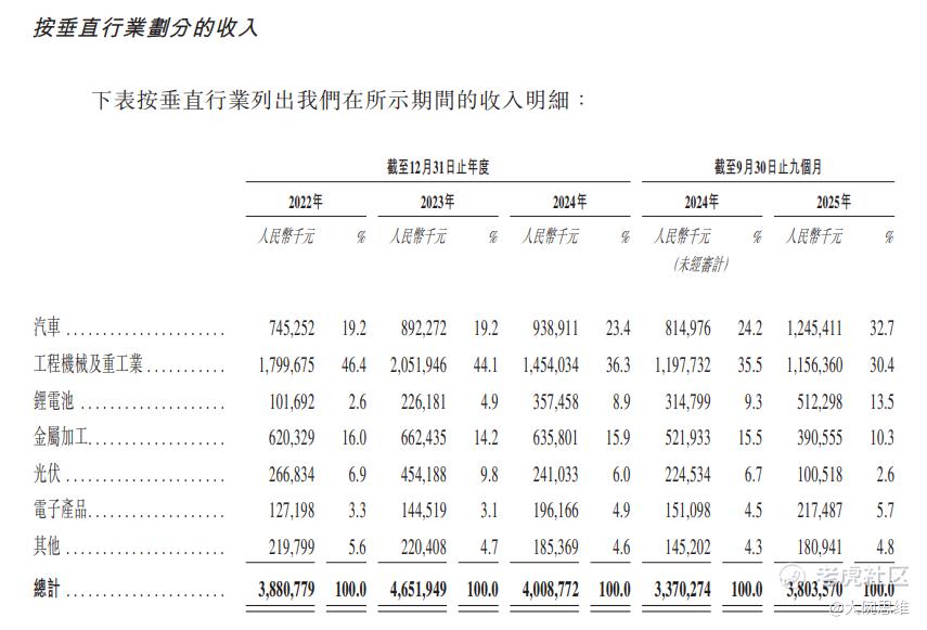 报告期,公司收入的行业分布结构发生显著变化,核心依赖的工程机械及重工业板块收入占比下滑,而汽车、锂电池板块收入占比则出现跨越式提升。