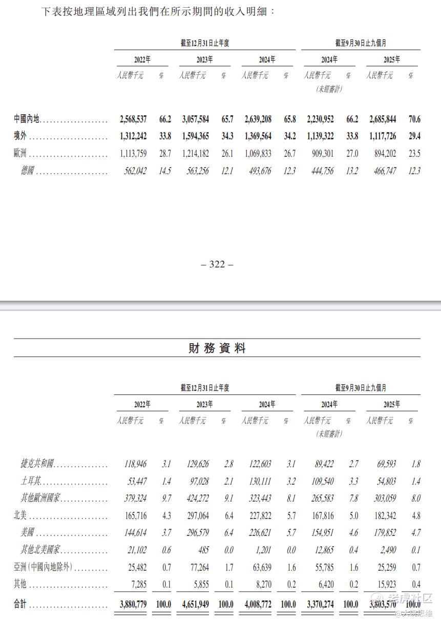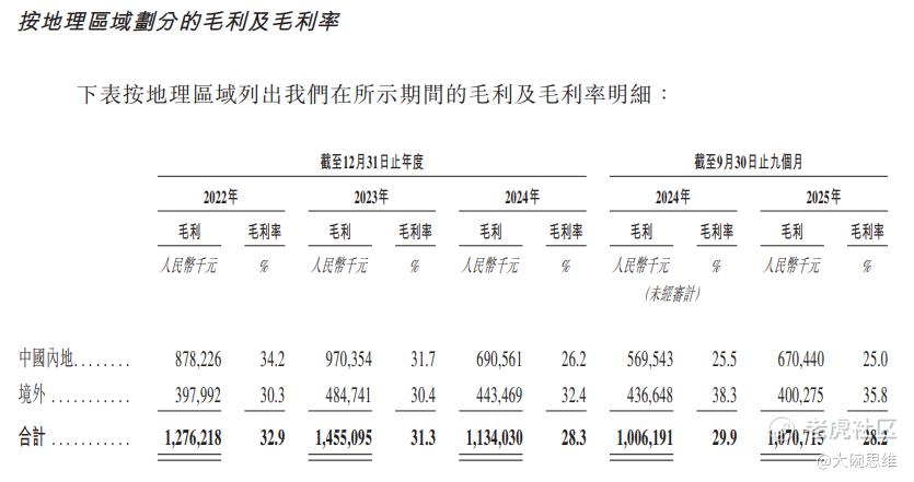 分区域来看,中国内地的毛利率从2022年的34.2%持续下滑至2025年1-9 月的25.0%;而境外市场的毛利率则从2022年的30.3%提升至2025年1-9 月的35.8%,表现出持续改善的态势。
