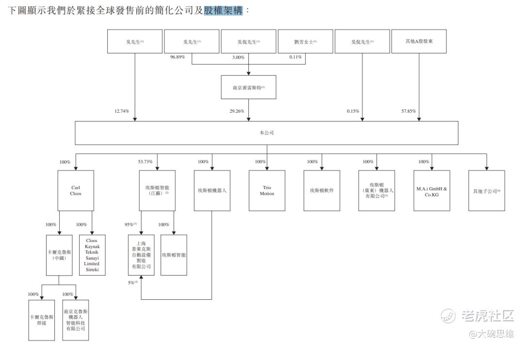 截至最后实际可行日期,控股股东集团合计持有埃斯顿约42.15%的表决权。具体看,吴波直接持股12.74%(110,996,700股);吴侃直接持股0.15%(1,263,033股);南京派雷斯特直接持股29.26%(254,894,742股),该公司由吴波、吴侃及刘芳分别持有96.89%、3.00%及0.11%权益。