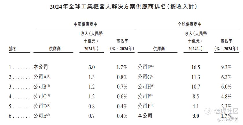 按2024年收入计,本公司在全球工业机器人解决方案市场中位列中国供应商第一、全球供应商第六。具体排名与市场份额如下表所示。