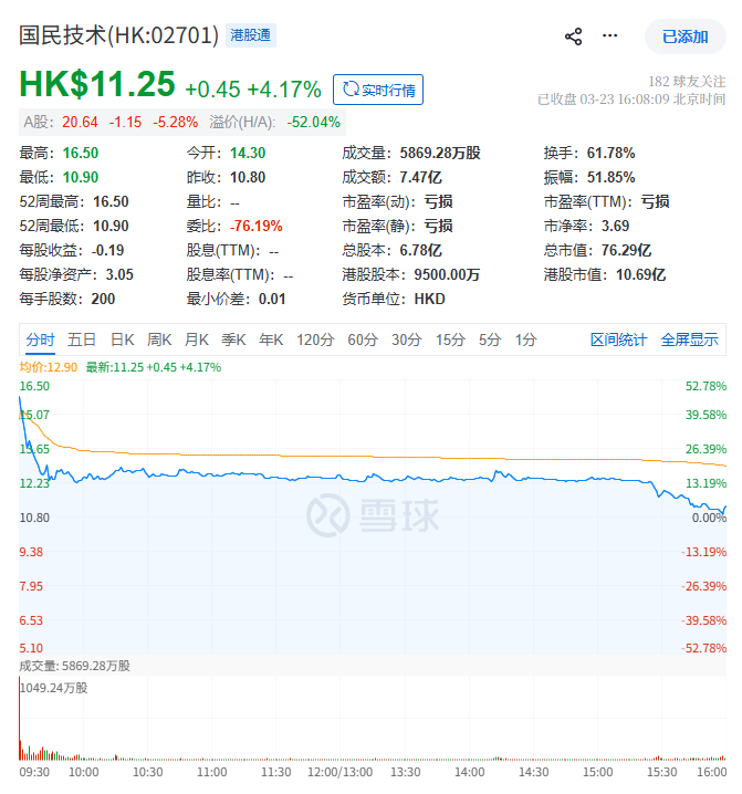 截至首日收市,国民技术每股收报11.25港元,涨4.17%,目前总市值约76.29亿港元。
