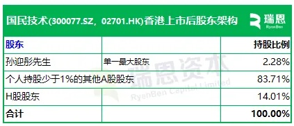 招股书显示,国民技术在上市后的股东架构中,孙迎彤先生,持股2.28%,为单一最大股东。