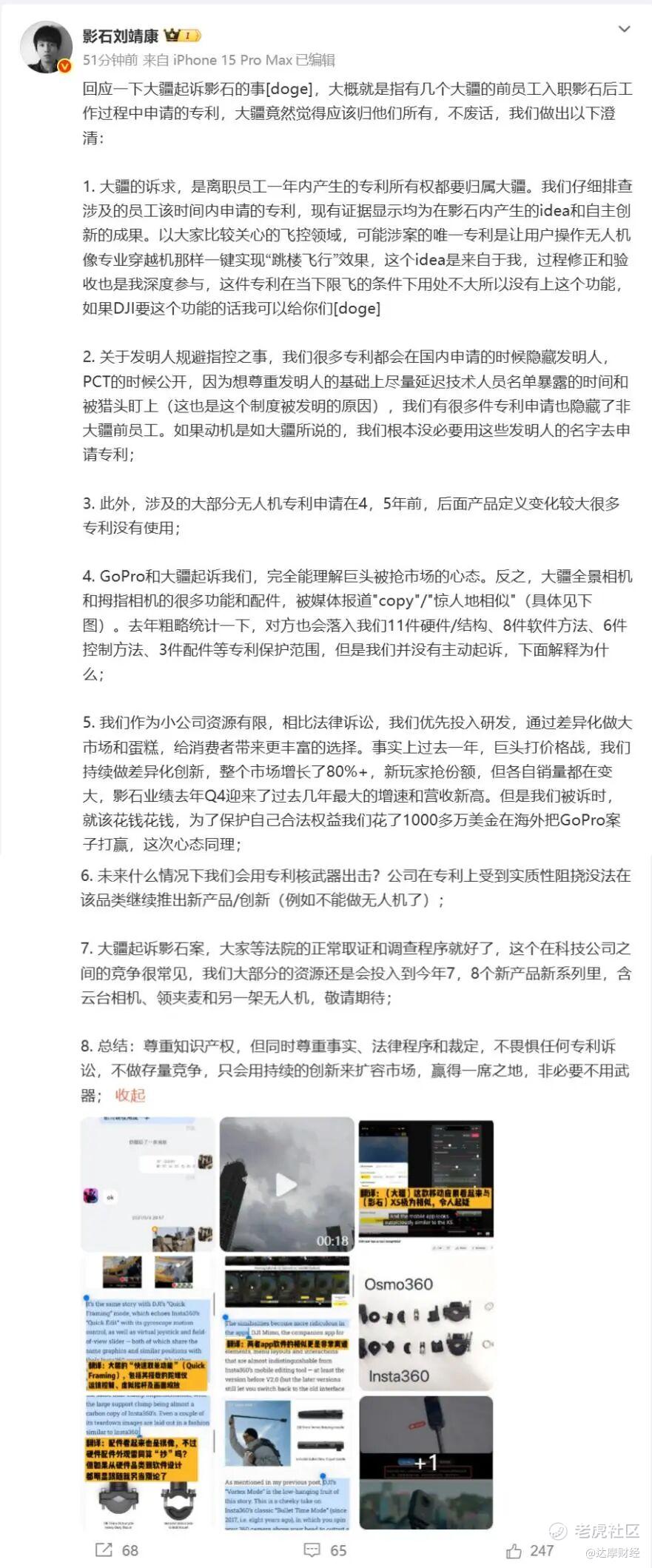 随着事件发酵,影石创新创始人刘靖康在微博上作出公开回应,称公司仔细排查了涉及员工在该时间内申请的专利,现有证据显示均为在影石内产生的idea和自主创新的成果。并表示,涉及的大部分无人机专利申请在4、5年前,后面产品定义变化较大,很多专利没有使用。