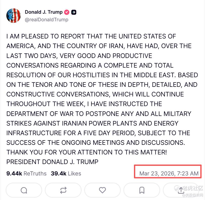 转折发生在美股盘前约两小时。特朗普在Truth Social上发布重磅消息:声称在过去48小时内与伊朗进行了“非常富有成效的对话”,并已指示国防部暂停对伊朗能源设施的一切打击,为期五天。