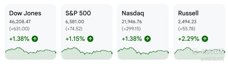 截至收盘,道指上涨1.38%(631点),标普500上涨1.15%,纳斯达克上涨1.38%,代表小盘股的罗素2000上涨2.3%。