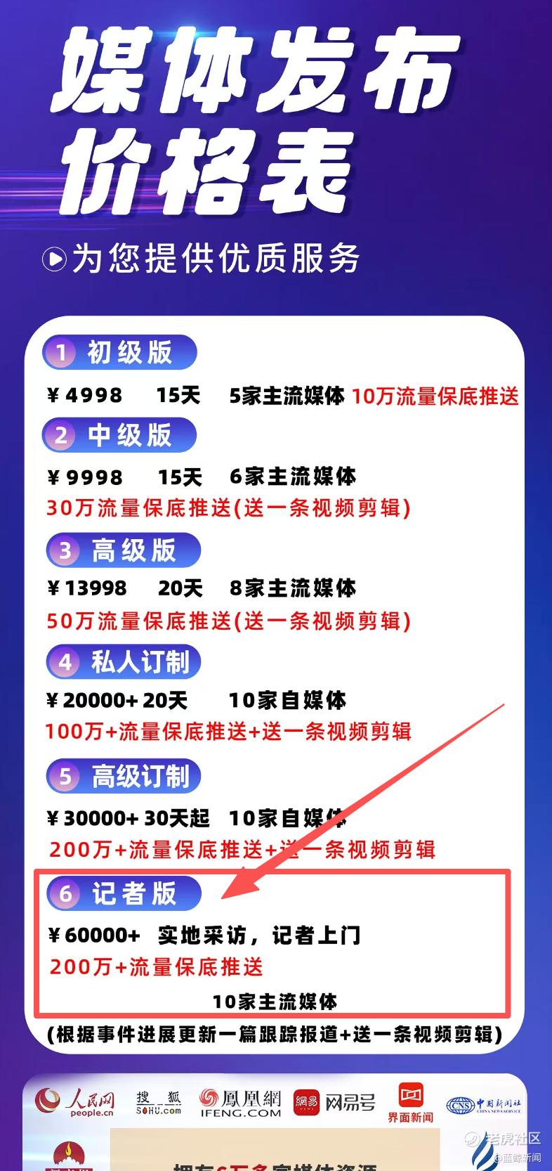 在谈到具体维权流程时,对方发来一张价目表:初级版收费4998元,覆盖5家主流媒体;最高报价6万元起,据称包含记者采访环节。