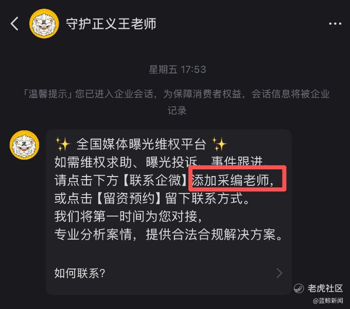 为进一步调查,蓝鲸记者以维权者的身份联系到该博主。随后,根据对方提供的资料,添加了其所谓的“采编老师”。