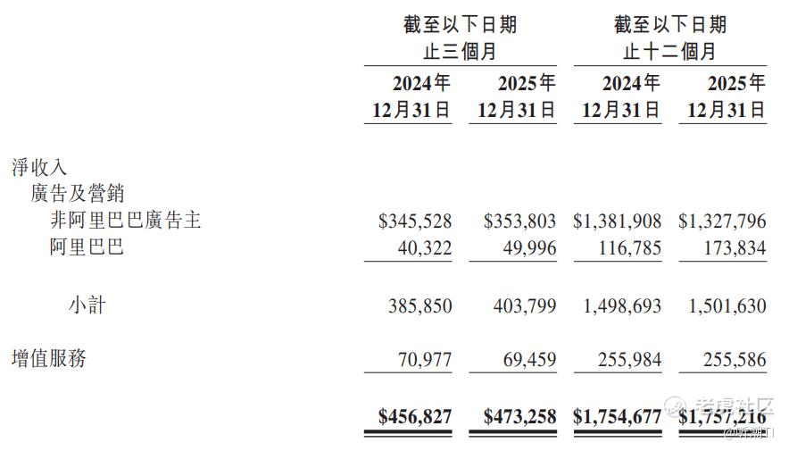 一边是非阿里广告主收入从13.82亿美元下降到13.28亿美元,同比减少约4%;另一边,阿里相关广告投入从1.17亿美元增长到1.74亿美元,同比增长接近50%。一增一减之间,广告大盘被维持在原有水平。