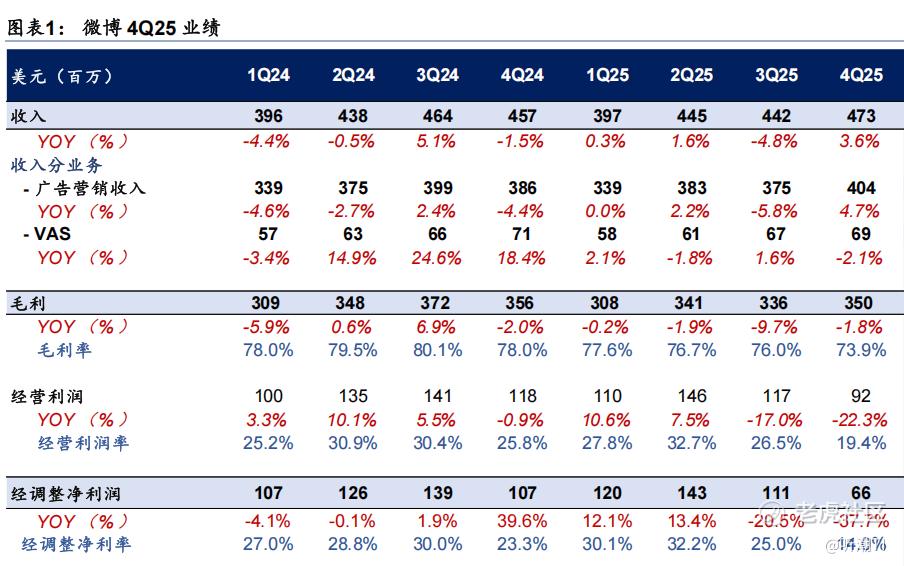 Q4微博的成本和费用总计3.82亿美元,同比增长13%,而同期收入增长只有4%。增加的部分主要来自广告制作成本上升和营销费用加大。经营利润率从去年同期的26%收窄至19%,GAAP口径下,单季度归属股东出现了470万美元的净亏损,是2025年四个季度里最难看的一份单季成绩单。