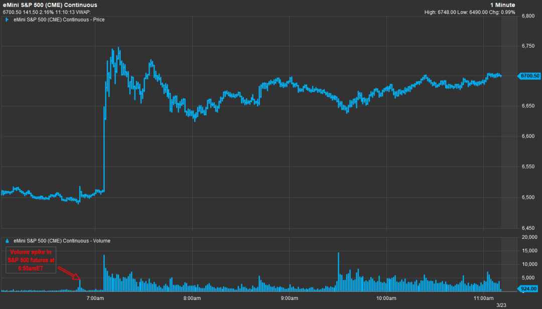 据 CNBC 报道,就在帖子发出前大约 15 分钟,也就是纽约时间早上 6 点 50 分左右,标普 500 期货和原油期货同时出现了一次异常的交易量飙升。