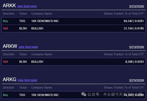 木头姐今天买入190万美元TXG、卖出150万美元BLSH。