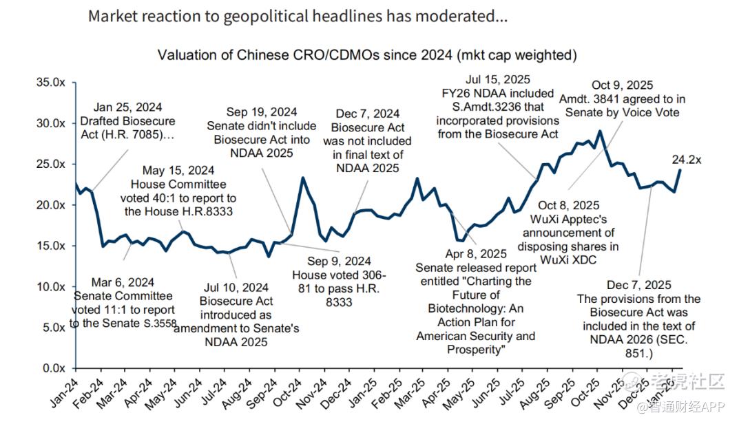 与高盛类似,机构普遍关注到地缘风险对中国CXO企业估值影响的消退。