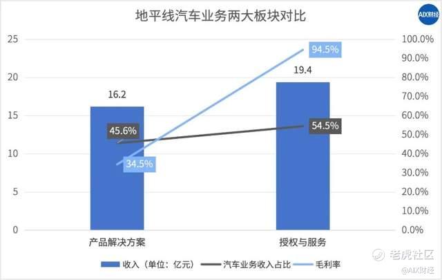 在汽车业务中,产品解决方案收入16.2亿元,同比增长144.2%,占汽车业务收入比重45.6%;而授权及服务收入19.4亿元,占比54.5%。两大业务从过去的三七开变成四六开,收入来源趋于均衡。