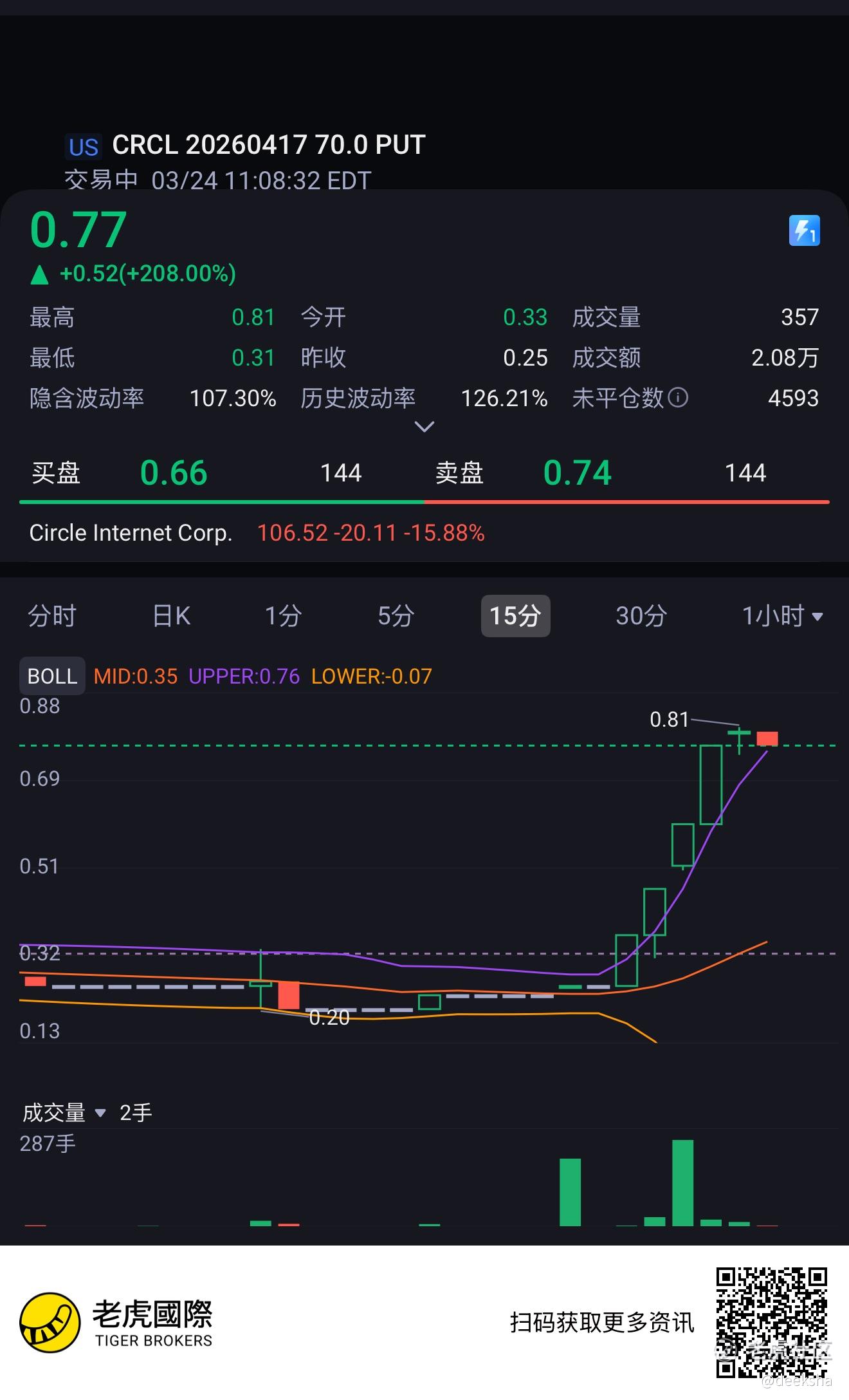 $CRCL 20260417 70.0 PUT$ 前两天 CRCL 在 136 附近呈现极度超买和量价背离,但我拒绝左侧盲目摸顶,耐心等待右侧扳机。直到标的跌破 VWAP 且小级别 MACD 死叉确认,才正式纳入狙击视野。
