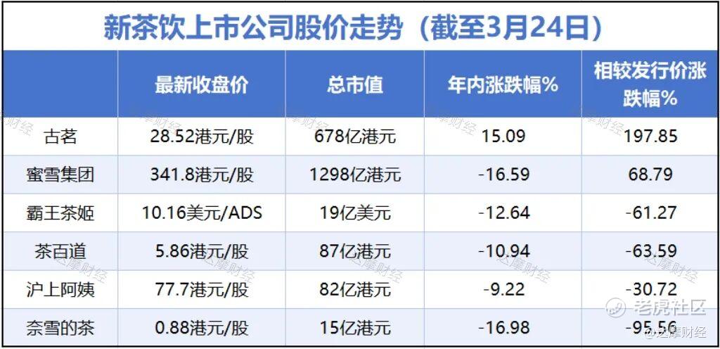 同在去年上市的古茗成为新茶饮行业的“股价黑马”,截至3月24日,公司股价收于28.52港元/股,总市值为678亿港元。古茗是2026年唯一一家股价上涨的新茶饮品牌,目前其股价较发行价上涨了近2倍。